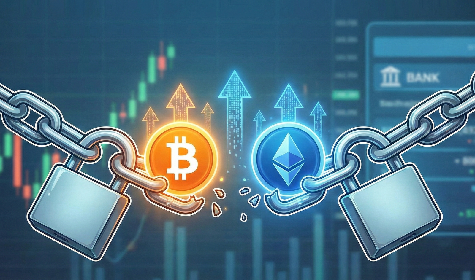 A imagem apresenta uma ilustração digital de alto impacto visual que simboliza a quebra de restrições financeiras, destacando as moedas de Bitcoin e Ethereum envoltas em correntes metálicas pesadas que se rompem violentamente no centro. No ponto de r...