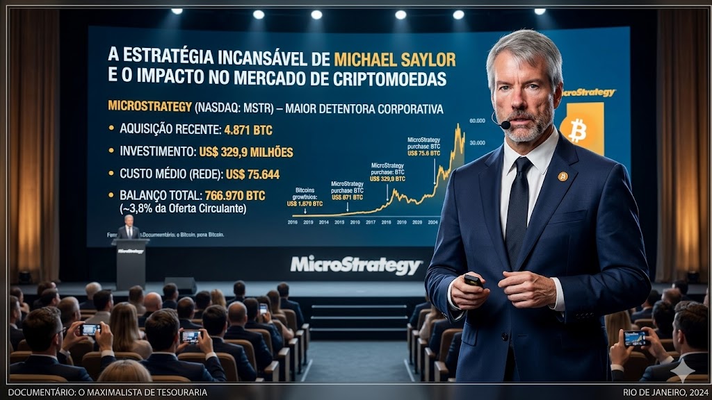 MicroStrategy investe US$ 330 milhões em Bitcoin, adicionando 4.871 BTC ao seu portfólio. A empresa de Michael Saylor agora detém