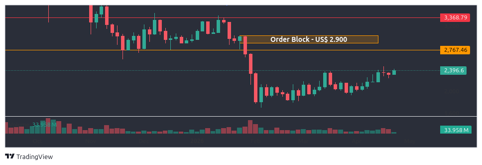 Com a atual estrutura, a faixa entre US$ 2.800 e US$ 2.900 passou a ser observada como uma zona chave. Esse nível concentra atenção por representar uma barreira importante que, se rompida, pode acelerar o movimento de alta.